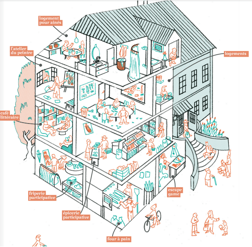 Elles sont pensées dans une forme économique et solidaire, s’appuyant sur les ressources locales et les circuits courts, et favorisant le réemploi. Elles essayent aussi de résoudre les problématiques rurales actuelles telle que: Comment moins prendre la voiture? Valoriser les producteurs ultra-locaux? Ne pas isoler les aînés ? Cultiver l’identité du village? L’ensemble de ces services et aménagements font sens, et permettent de faire de cette maison un espace vivant, où chaque génération pourra y trouver sa place, et y apprendre les uns des autres.